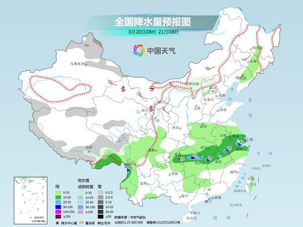 降水方面,受暖湿气流主导,南方新一轮降水序幕从3月18日已经正式拉开,湖北南部、湖南北部、江西北部、浙江西部一带雨势强劲,昨天切变线东移至江南中北部,江南北部降水明显增强,像是江西北部、浙江南部、福建北部、湖南东北部等地部分地区出现大雨或暴雨。北方的降水则主要集中在新疆,受冷空气影响,新疆北部部分地区降水明显,新疆北部及沿天山地区、青海南部、西藏东部、甘肃中部偏西地区、山西北部等地部分地区出现小到中雪或雨夹雪。