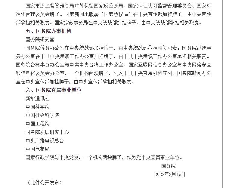 国家市场监督管理总局对外保留国家反垄断局、国家认证认可监督管理委员会、国家标准化管理委员会牌子。国家新闻出版署(国家版权局)在中央宣传部加挂牌子,由中央宣传部承担相关职责。国家宗教事务局在中央统战部加挂牌子,由中央统战部承担相关职责。