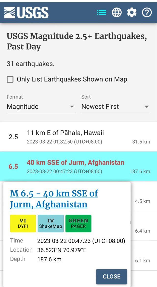 据报道,这场地震发生在阿富汗东北部巴达赫尚省城镇尤尔姆东南偏南40公里处,震级里氏6.5级,震源深度187.6公里。