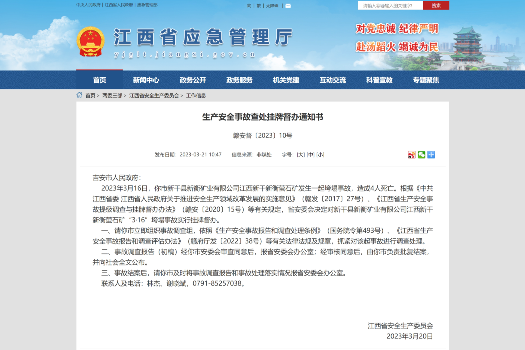 央广网吉安3月23日消息(记者胡斐)3月21日,江西省安全生产委员会发布通报:2023年3月16日,新干县新衡矿业有限公司江西新干新衡萤石矿发生一起垮塌事故,造成4人死亡。根据《中共江西省委 江西省人民政府关于推进安全生产领域改革发展的实施意见》(赣发〔2017〕27号)、《江西省生产安全事故提级调查与挂牌督办办法》(赣安〔2020〕15号)等有关规定,省安委会决定对新干县新衡矿业有限公司江西新干新衡萤石矿“3·16”垮塌事故实行挂牌督办。