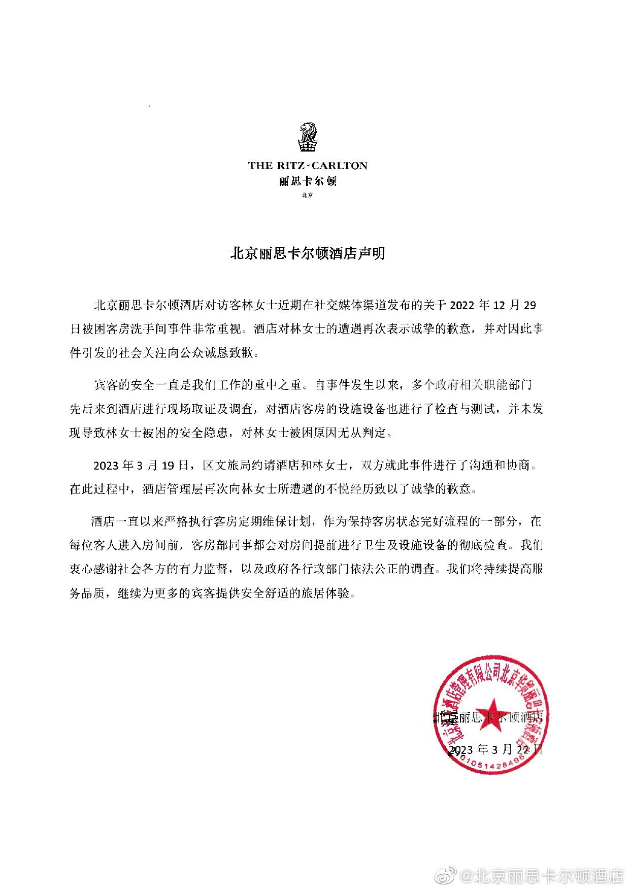 3月15日,北京丽思卡尔顿酒店发布声明指出,林女士在社交媒体发布的“被困酒店厕所事件”发生在2022年12月29日。事发当天,酒店团队在得知情况后第一时间询问客人情况并真诚地送去了慰问。酒店管理层亦当面对客人遭遇的意外表达了诚挚的歉意并提供了相关和解补偿方案,但客人与酒店未能就和解方案达成一致。此外,酒店在事发后已立即对所有客房的门锁,电话及其他硬件进行了排查和检测,杜绝类似事件再度发生。