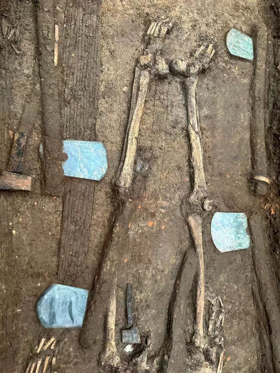 图为黄山遗址M216大墓精细清理出的四把玉钺。