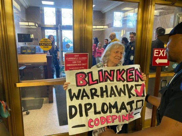 根据美国反战组织“粉色代码”发表的声明,他们打断布林肯的讲话,是希望以此提醒“美国在讨论资金预算前,应开始进行真正的外交实践。”