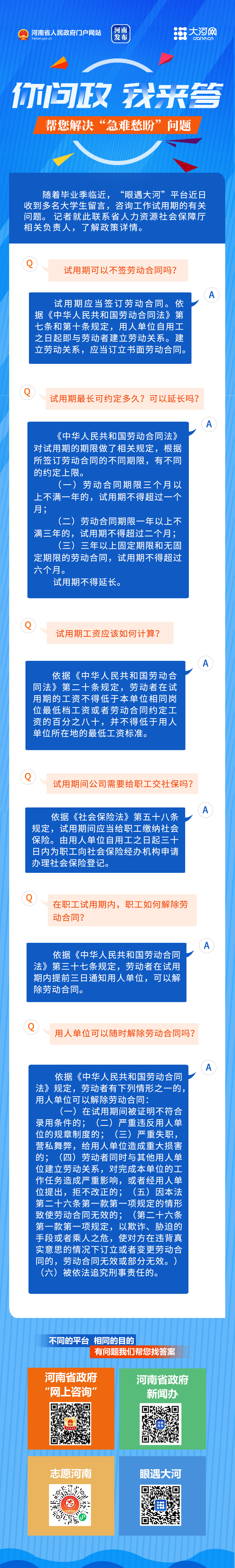 大河网讯 试用期可以不签劳动合同吗?试用期交社保吗?随着毕业季临近,“眼遇大河”平台及“河南发布”微信公众号近日收到多名大学生留言,咨询工作试用期的有关问题。