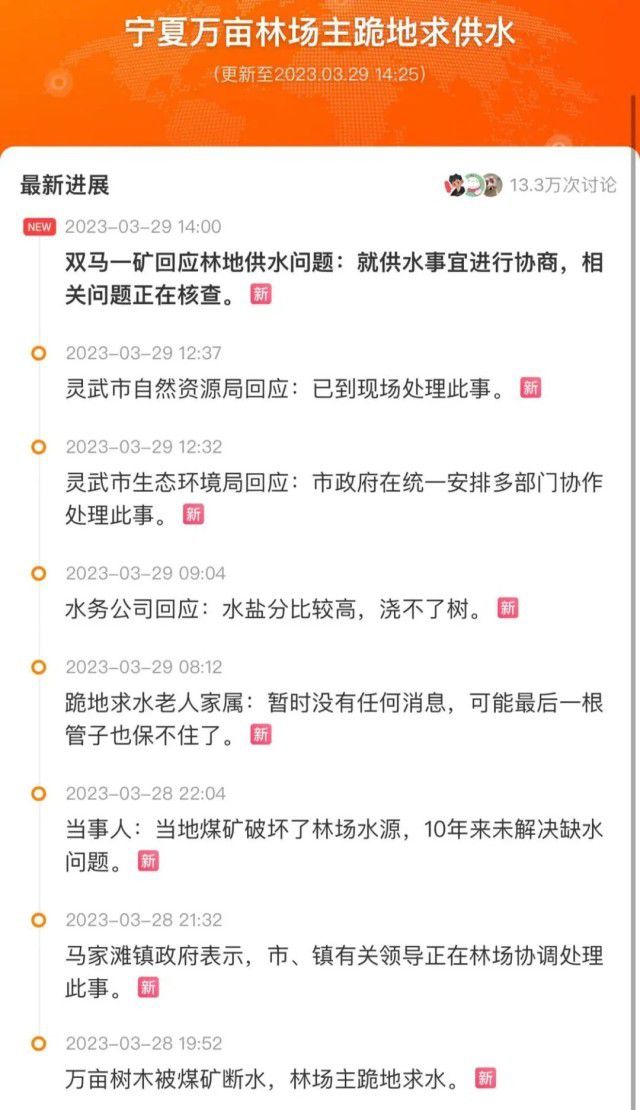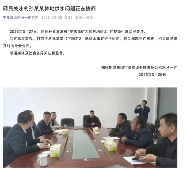 3月29日中午,微信公号“宁夏煤业双马一矿之声”发文称,目前正与孙某某就供水事宜进行协商,相关问题正在核查,相关情况将及时向社会公布。