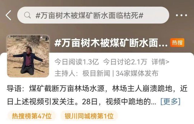 据红星新闻消息,该男子表示,2003年他在宁夏灵武市马家滩镇承包了万亩荒沙滩植树治沙,但当地的双马煤矿破坏了林场的水源,煤矿曾承诺3月27日向林场供水,但未能兑现,导致他情绪崩溃跪地。