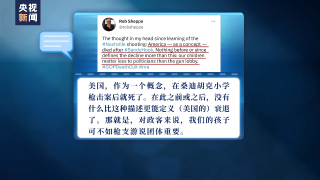 “美国,作为一个概念,在桑迪胡克小学枪击案后就死了。在此之前或之后,没有什么比这种描述更能定义(美国的)衰退了。那就是,对政客来说,我们的孩子可不如枪支游说团体重要。”