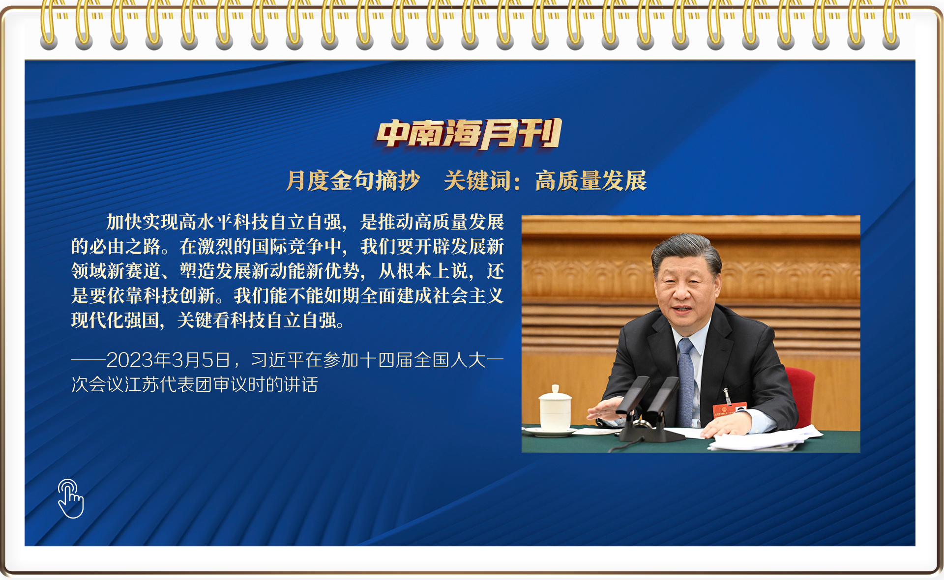 5日,今年全国两会首次到团组,总书记以高质量发展为题,从“制造业必须筑牢”聊到农业现代化,再谈到太湖水质……他详细阐述未来中国高质量发展的发力点——高水平科技自立自强、加快构建新发展格局、推进农业现代化、人民幸福安康,为未来中国发展绘就新图景。