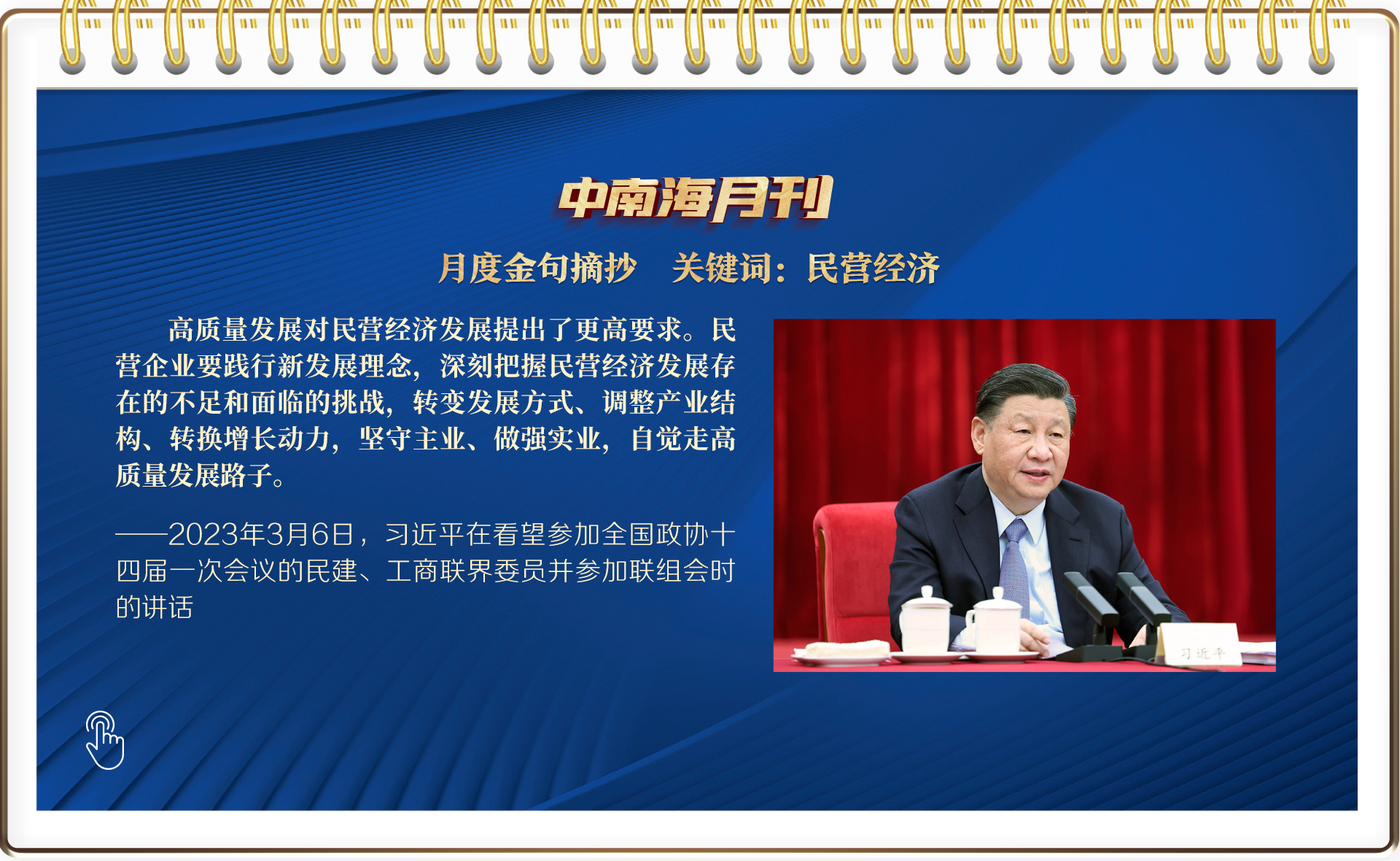 次日,总书记参加以经济界人士为主的民建、工商联界委员联组会。春日的暖阳中,北京友谊宾馆聚英厅内讨论热烈。迎着委员们热切的目光,总书记为民营企业和民营企业家提振信心:“始终把民营企业和民营企业家当作自己人”“放开手脚,轻装上阵,专心致志搞发展”“在民营企业遇到困难的时候给予支持,在民营企业遇到困惑的时候给予指导”……声声关切,统筹破与立,把握制与治。其落点,也在高质量发展。