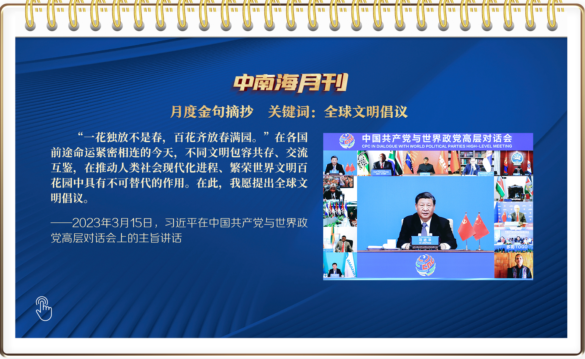 带着对人类文明过去、现在和未来的深邃思考,习近平总书记在本月举办的全球性政党盛会上,以四个“共同倡导”为实现路径,郑重提出全球文明倡议。继全球发展倡议、全球安全倡议之后,这一中国智慧再次引发全球共鸣。