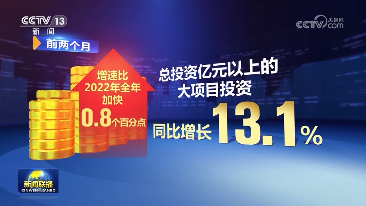 前两个月,全国固定资产投资同比增长5.5%,增速比2022年全年明显加快,其中,总投资亿元以上的大项目投资同比增长13.1%,增速比2022年全年加快0.8个百分点。