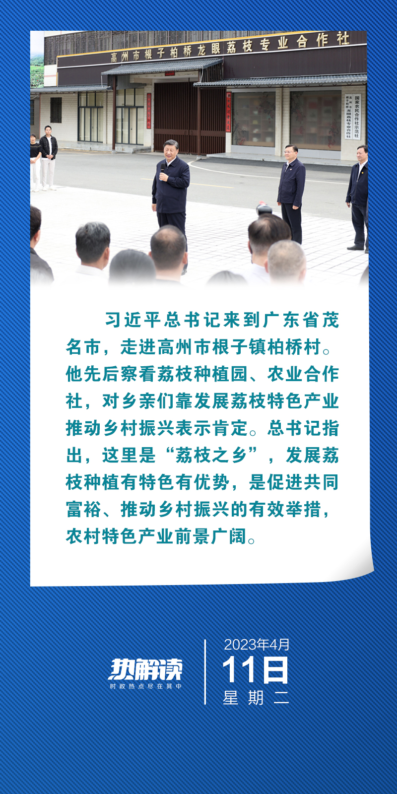 热解读 4月11日,广东之行第二天,习近平总书记来到茂名市高州市根子镇柏桥村。该村有着2000余年荔枝种植历史,村内的贡园,更是目前全国面积最大、历史最悠久、品种最齐全的古荔园之一,享有“荔枝博物馆”的美誉。