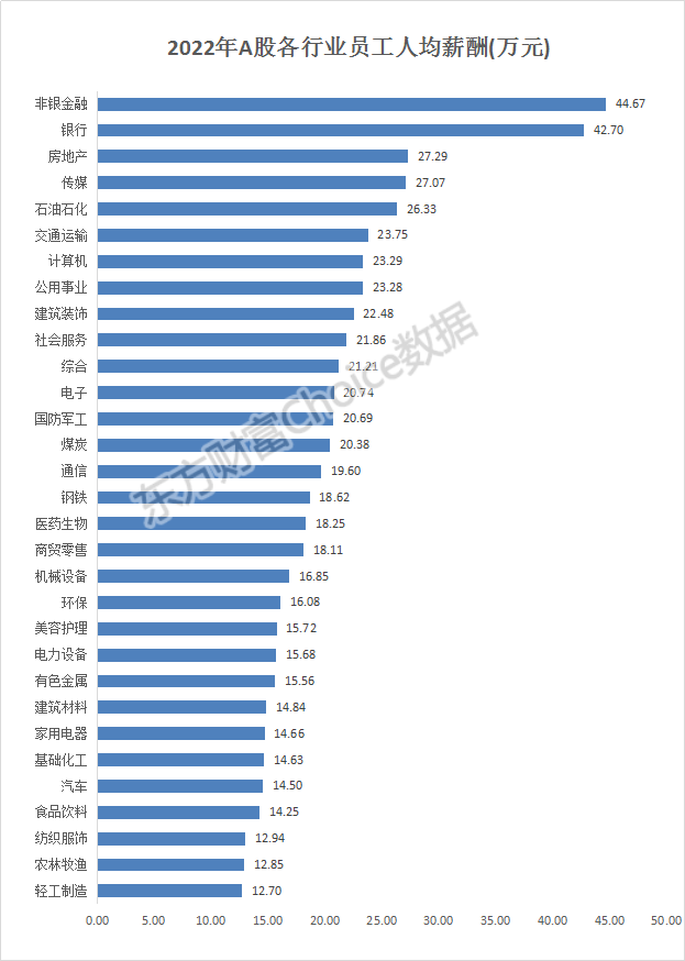 东方财富Choice数据统计显示,非银金融、银行和房地产员工人均薪酬(行业薪酬总额/行业员工数)位列前三,2022年员工人均薪酬分别为44.67万元、42.70万元和27.29万元;轻工制造、农林牧渔纺织服装的员工人均薪酬排在倒数前三。