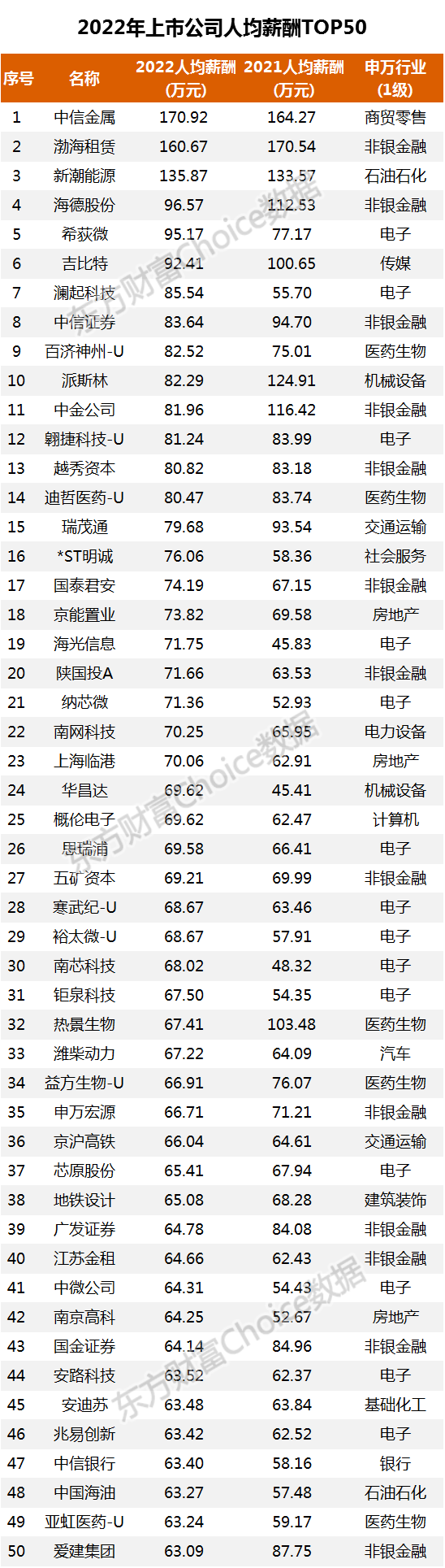 东方财富Choice数据显示,2022年A股人均薪酬排名前50的上市公司人均薪酬均超过60万,其中3家公司更是超过百万。