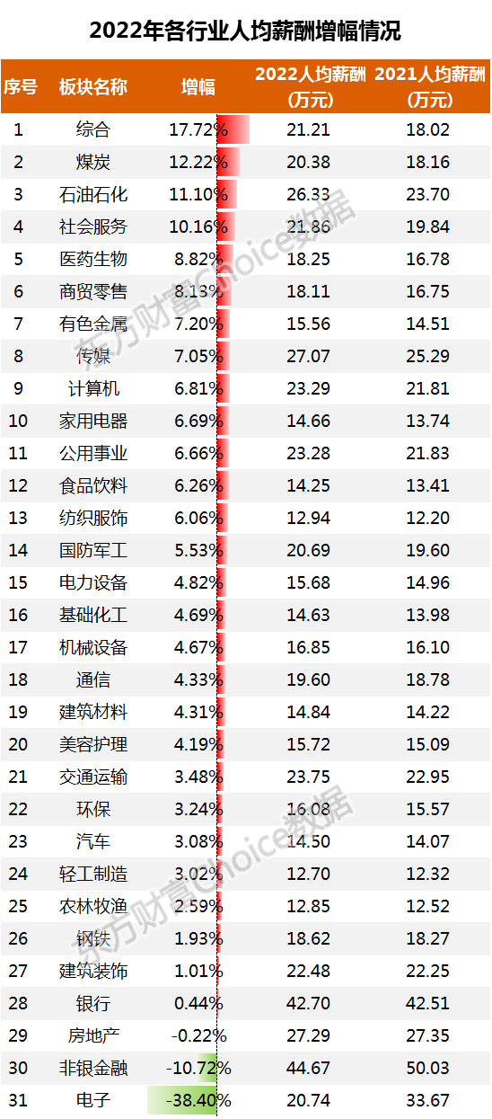 申万31个一级行业中,相较2021年,2022年28个行业人均薪酬均有所上涨,其中综合行业人均薪酬增幅最大,人均薪酬上涨17.72%,其次为煤炭行业,人均薪酬上涨12.22%,排名第三的是石油石化行业,人均薪酬上涨11.10%。