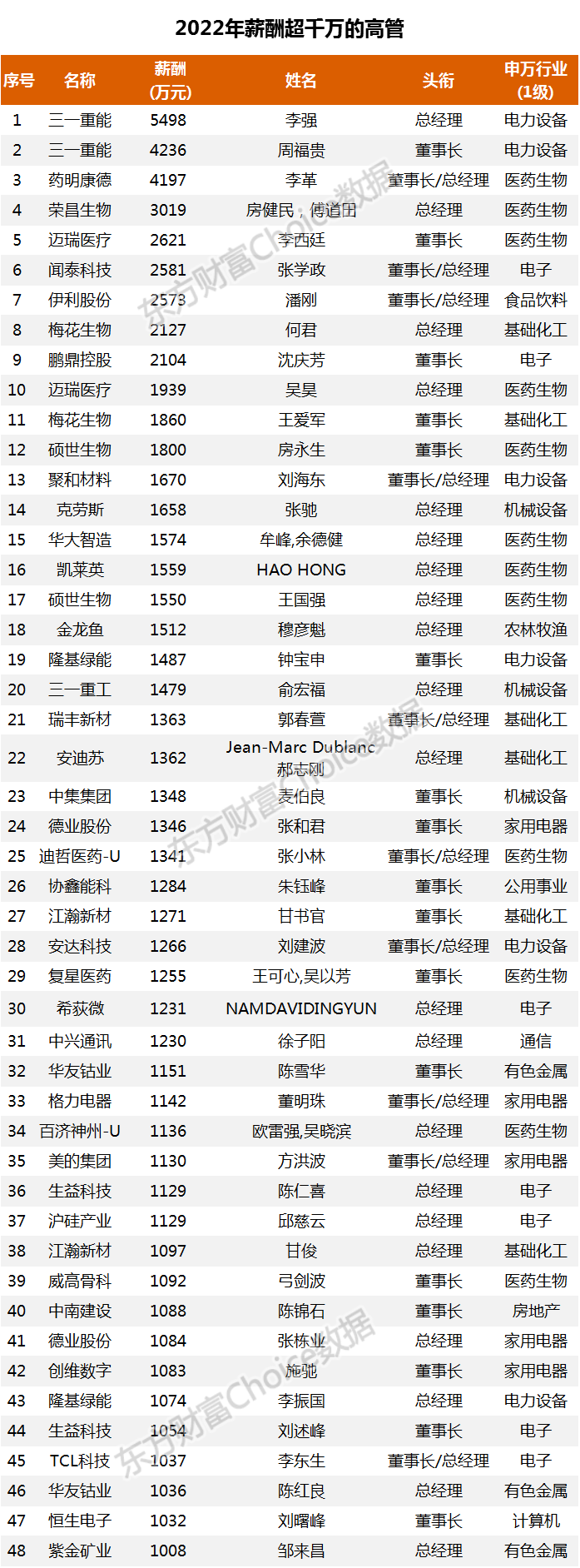 具体到个人,东方财富Choice数据显示,2022年共有53位上市公司高管薪酬超过1000万,其中三一重能总经理李强与董事长周富贵分别以5498万元与4236万元领跑高管薪酬榜第一与第二位。