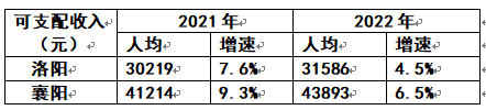 由此衍生出人均可支配收入的差距:2021、2022年襄阳的人均可支配收入分别高出洛阳10995元和12307元。增速之差也由2021年的1.7个百分点扩大为2.0个百分点。请看下表: