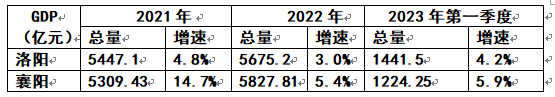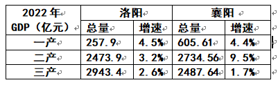 可看出:2021年襄阳GDP的增速是洛阳的3.06倍;2022年是洛阳的1.8倍;今年第一季度,尽管洛阳的总量超过襄阳217.25亿元,但是在增速上仍然低于襄阳1.7个百分点。这说明:洛阳要想把襄阳甩下去,必须在增速上下功夫。