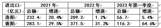 可看出:洛阳从2021到2022年的开放度在收缩,进出口总量在下降,增速在锐减。到了今年的第一季度出现了回暖。