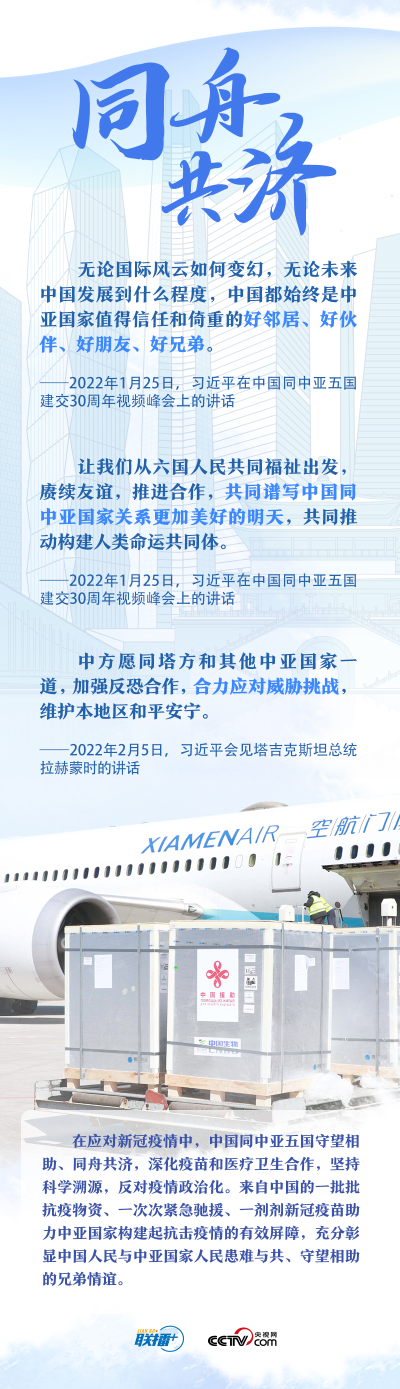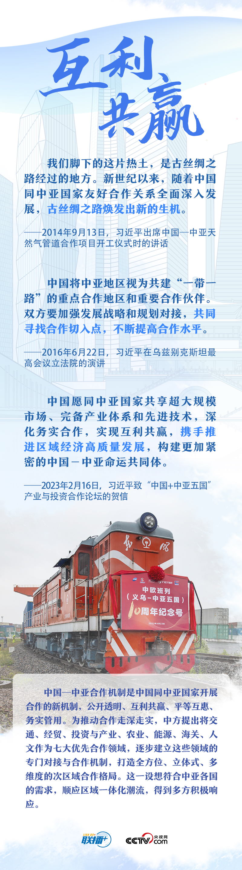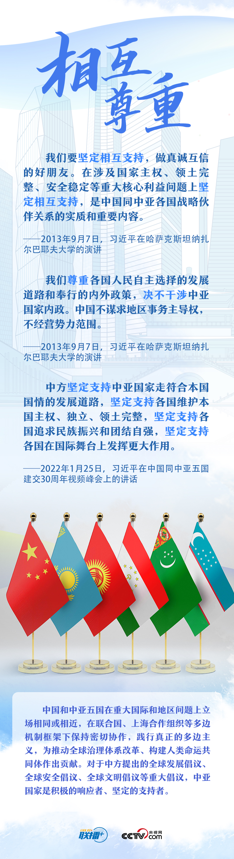 习主席把中国同中亚五国合作的成功密码总结为“相互尊重、睦邻友好、同舟共济、互利共赢”。他强调,这四项原则是在合作中积累的宝贵经验和共同财富,是中国同中亚国家关系行稳致远的政治保障,也是中国同中亚国家友好交往继往开来的力量源泉。央视网《联播+》与您一起学习。