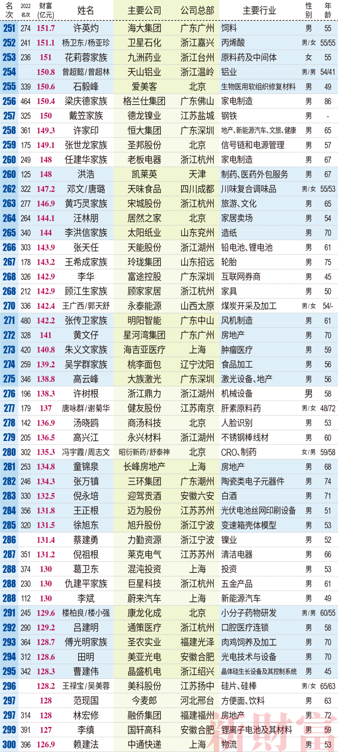 据悉,此榜单根据候选人拥有的主要企业,对其财富进行评估,主要方法为:对于上市公司,以2022年12月31日收盘市值(2023年新上市公司以2023年3月20日收盘价为准)×持股比例计算;对于已披露上市计划的非上市公司,根据2022年净利润估计数×可比上市公司2022年12月31日收盘价计算的市盈率×股权比例计算;对于其他非上市公司,以净资产×股权比例计算,并参考其最后一次私募融资时的估值情况。