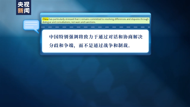 “中国特别强调将致力于通过对话和协商解决分歧和争端,而不是通过战争和制裁。”