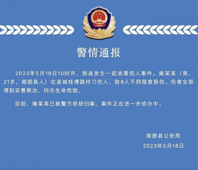 央视网消息:据四川省南充市南部县公安局,5月18日10时许,南部县发生一起故意伤人案件。雍某某(男,21岁,南部县人)在县城桂博路持刀伤人,致8人不同程度受伤。
