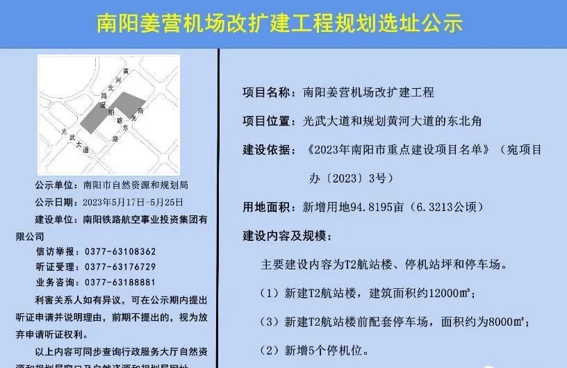 【大河财立方消息】5月17日,南阳市自然资源和规划局官网对“南阳姜营机场改扩建工程规划选址”进行了公示,公示中提出了南阳姜营机场将新增用地94亩(6公顷),并将新建T2航站楼及配套设施。