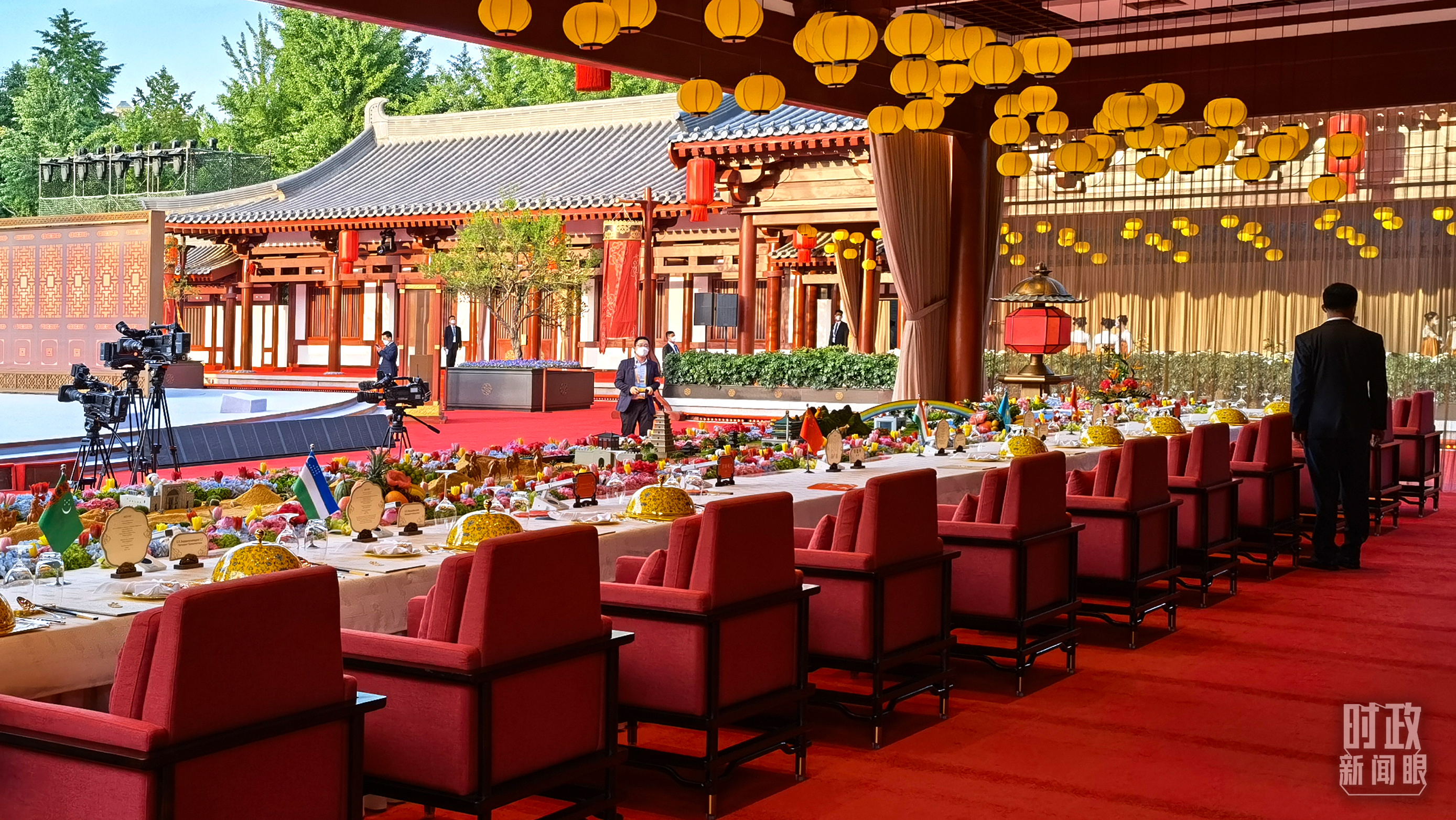 △欢迎晚宴的餐台设计融入古丝绸之路和“一带一路”元素,并穿插中国和中亚五国的标志性建筑,独具匠心。(总台央视记者石丞拍摄)