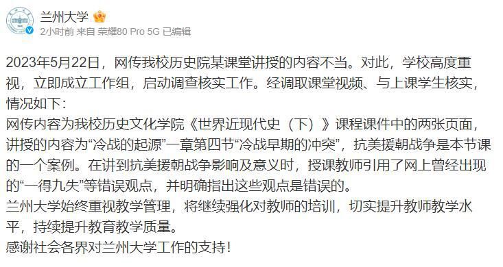 中新网5月23日电 兰州大学23日通过官方微博发布消息称,2023年5月22日,网传兰州大学历史院某课堂讲授的内容不当。对此,学校高度重视,立即成立工作组,启动调查核实工作。经调取课堂视频、与上课学生核实,情况如下: