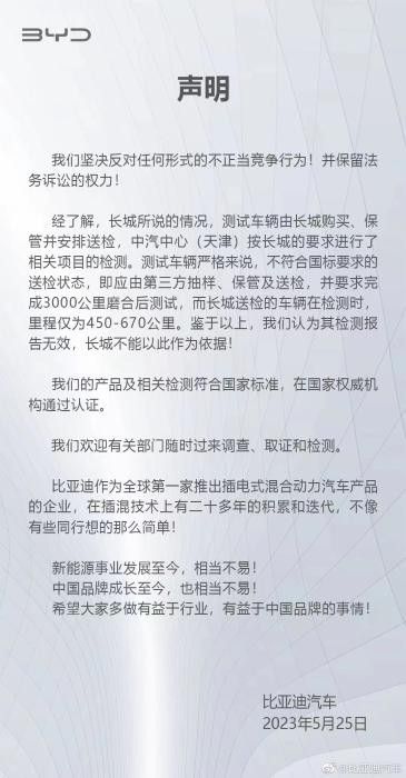 比亚迪称,经了解,长城所说的情况,测试车辆由长城购买、保管并安排送检,中汽中心(天津) 按长城的要求进行了相关项目的检测。测试车辆严格来说,不符合国标要求的送检状态,即应由第三方抽样、保管及送检,并要求完成3000公里磨合后测试,而长城送检的车辆在检测时,里程仅为450-670公里。鉴于以上,比亚迪认为其检测报告无效,长城不能以此作为依据。