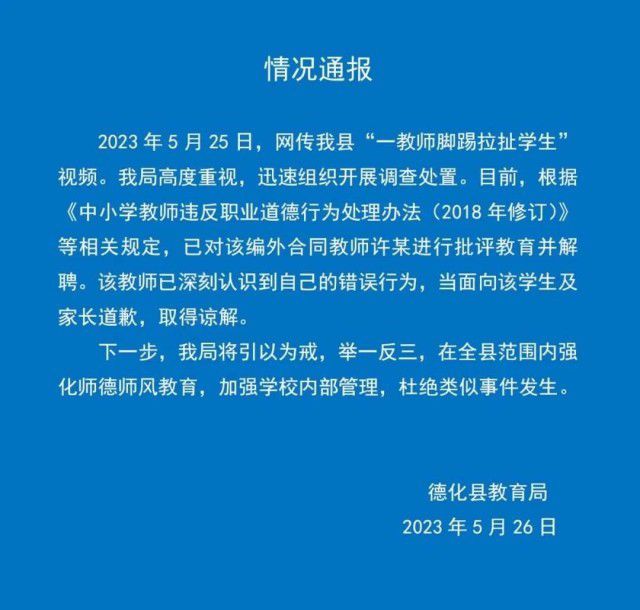 福建德化教育局通报“教师脚踢拉扯学生”:已解聘