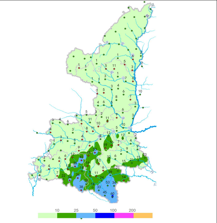 陕西省2098处雨情站降雨量大于25毫米110站,其中大于50毫米3站,分布在镇坪、平利、鄠邑等3县区。降雨量前三位分别为:发龙(镇坪)60.4毫米,柳林(平利)53.4毫米,长坪(鄠邑)52.8毫米。