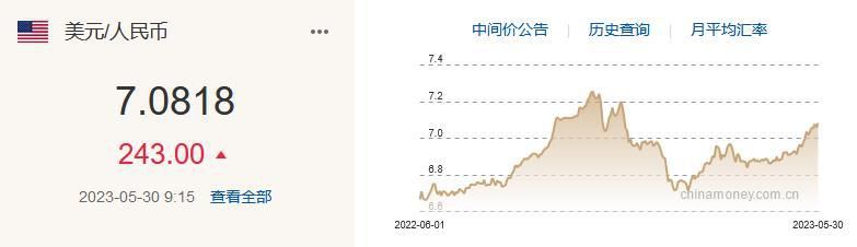 中新网5月30日电 中国人民银行授权中国外汇交易中心公布,5月30日人民币对美元中间价报7.0818,下调234个基点。(中新财经)