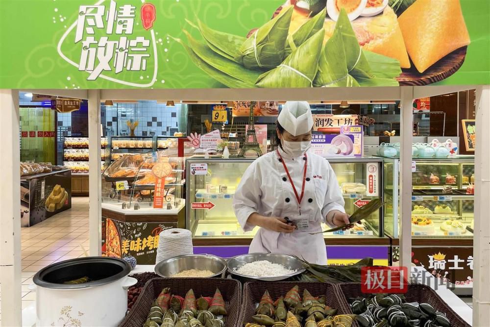 端午将近,极目新闻记者走访了解到,早在5月初,武汉各大商超的粽子就已抢鲜上市,前期以礼盒、包装粽子为主,现在手工粽子、散称粽子等也都陆续上架,端午相关商品迎来销售旺季。因高考、中考在即,还有很多顾客会选择购买粽子绿豆糕或粽子凉糕礼盒,粽子与糕的搭配寓意“高中”,寓意好运或表达美好的愿望。