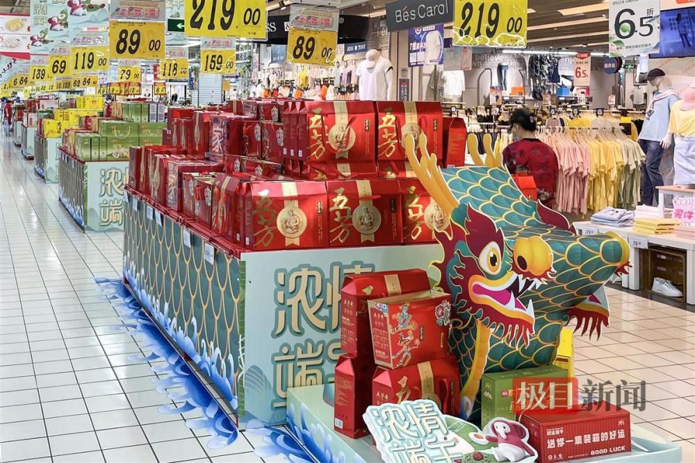 5月31日,在大润发超市武汉姑嫂树店,各式各样的粽子礼盒都摆在了主通道最显眼的位置,醒目的龙头、碧绿的粽叶造型,氛围感十足。