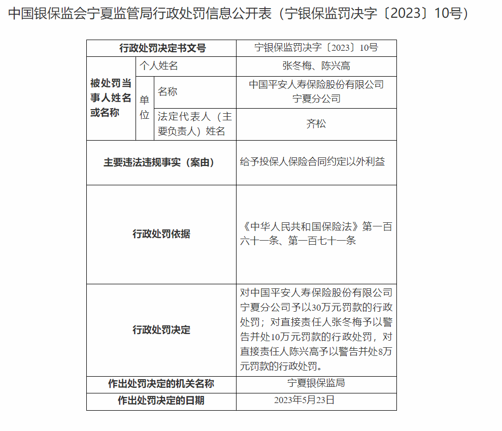 中国青年网北京5月31日电 据国家金融监管总局网站消息,近日,中国平安人寿保险股份有限公司宁夏分公司因给予投保人保险合同约定以外利益被予以30万元罚款的行政处罚;对直接责任人张冬梅予以警告并处10万元罚款的行政处罚,对直接责任人陈兴高予以警告并处8万元罚款的行政处罚。