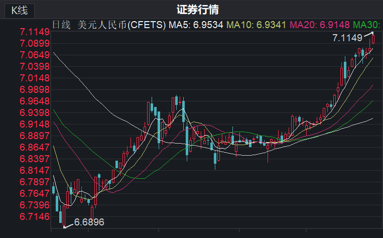 自5月17日在岸、离岸人民币对美元汇率双双跌破“7”关口后,人民币继续走弱。5月31日,离岸人民币、在岸人民币跌破“7.1”关口。其中,美元/在岸人民币汇率盘中出现7.1149高点。近半个月来,人民币对美元的汇率多数时间维持在“7”上方,这是去年底以来人民币再次破“7”。