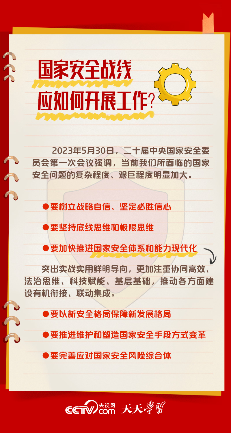 5月30日,习近平总书记主持召开二十届中央国家安全委员会第一次会议时强调,要全面贯彻党的二十大精神,深刻认识国家安全面临的复杂严峻形势,正确把握重大国家安全问题,加快推进国家安全体系和能力现代化,以新安全格局保障新发展格局,努力开创国家安全工作新局面。