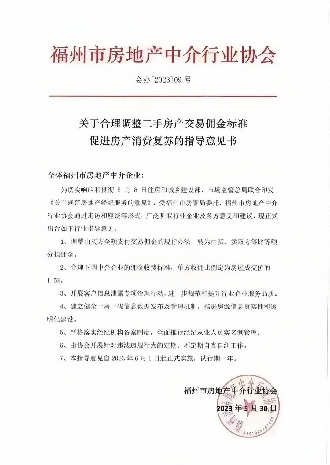 记者获悉,福州市房地产中介行业协会日前发布了《关于合理调整二手房产交易佣金标准促进房产消费复苏的指导意见书》,指导意见书称,调整由买方全额支付交易佣金的现行办法,转为由买、卖双方等比等额分担佣金;合理下调中介企业的佣金收费标准,单方收佣比例定为房屋成交价的1.5%,指导意见自2023年6月1日起正式实施,试行期一年。
