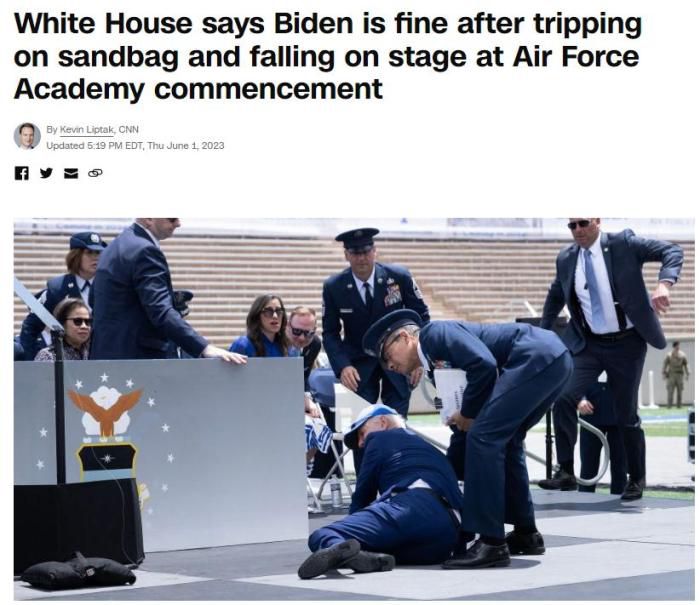 中新网6月2日电 综合美媒报道,当地时间6月1日,美国总统拜登出席在科罗拉多州举行的美国空军学院毕业典礼期间,被现场的沙袋绊倒,不慎摔倒在讲台上。