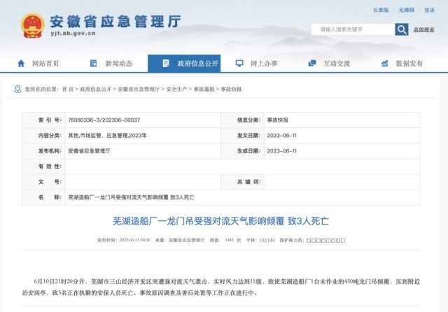 安徽省应急管理厅6月11日早上通报:6月10日21时20分许,芜湖市三山经济开发区突遭强对流天气袭击,实时风力达到11级,致使芜湖造船厂1台未作业的450吨龙门吊倾覆,压到附近治安岗亭,致3名正在执勤的安保人员死亡。事故原因调查及善后处置等工作正在进行中。