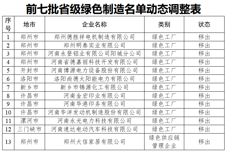 通知称,按照动态调整管理要求,经各个现场复核专家组核实确认,最终确定河南省12家省级绿色工厂、1家绿色供应链管理企业绿色制造水平关键指标不符合绿色制造评价要求,河南省工信厅决定取消其荣誉称号,并移出省级绿色制造名单。