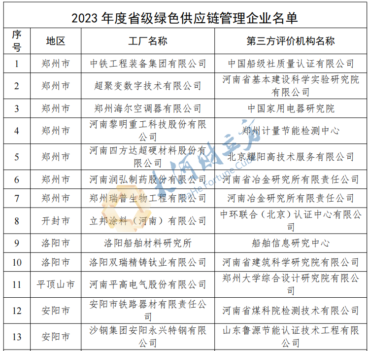 【大河财立方消息】6月16日,河南省工业和信息化厅公布2023年度省级绿色制造名单,其中包括绿色工厂109家、绿色工业园区9个、绿色供应链管理企业22家、绿色设计产品型号25个。