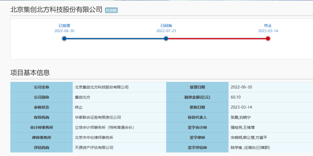 上交所发行上市审核信息显示,集创北方于2022年6月申请科创板IPO获受理,拟融资金额60.1亿元;保荐机构为华泰联合证券,会计师事务所为立信所,律师事务所为中伦所。