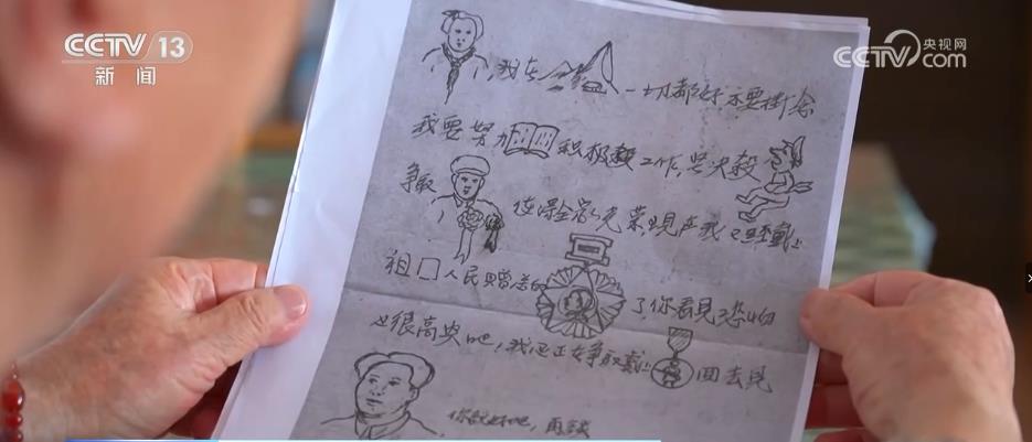 在战火纷飞的年代,从战场辗转寄出的家书有很多很多。其中,有这样一封特别的信,两座小山包代表“上甘岭”、一本书表达“读书”、妹妹是一个戴着红领巾的可爱小姑娘。泛黄的纸上,是充满关切的文字和有爱的插画。