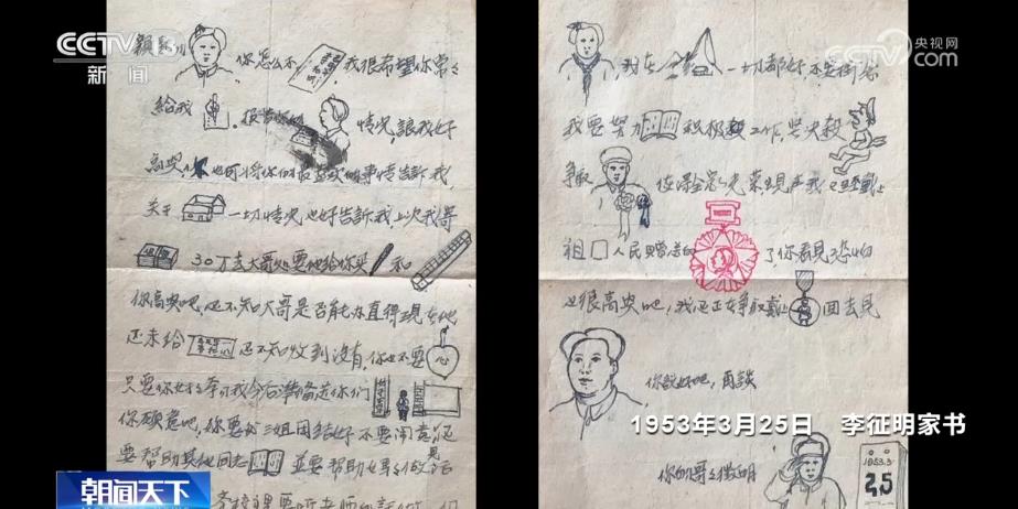 这是一封1953年3月25日从抗美援朝战场发往江苏宿迁的信。在这封战地家书中,志愿军战士李征明为未来的奋斗目标做出规划。因为妹妹们的年龄还很小、识字不多,李征明担心她们看不懂,就在信中画上了许多图文并茂的小画。