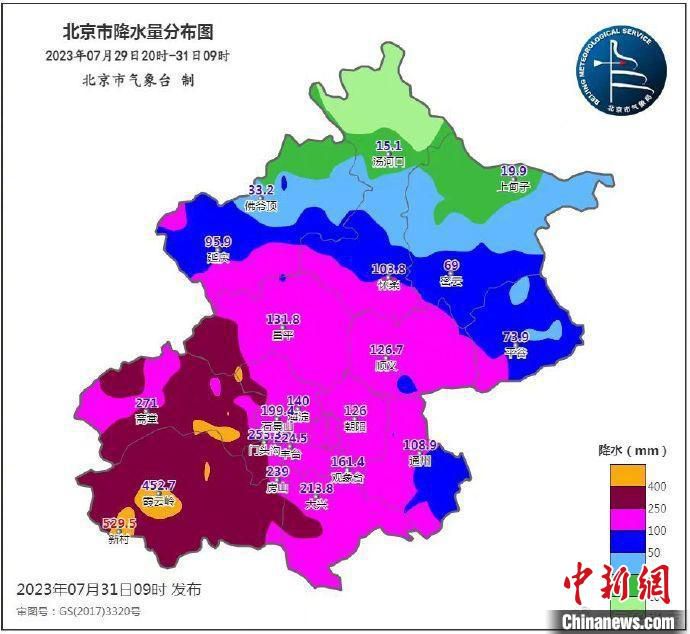 来自北京市气象台的数据显示,29日20时至31日9时,北京平均降雨量149.6毫米,城区平均159.2毫米,房山区平均326.0毫米,门头沟平均287.3毫米;最大降雨出现在房山新村,529.5毫米;最大小时雨强出现在大兴庞各庄,31日7至8时65.8毫米/小时(因电力、通信基站故障,房山14个、门头沟30个、昌平1个气象站数据未更新)。