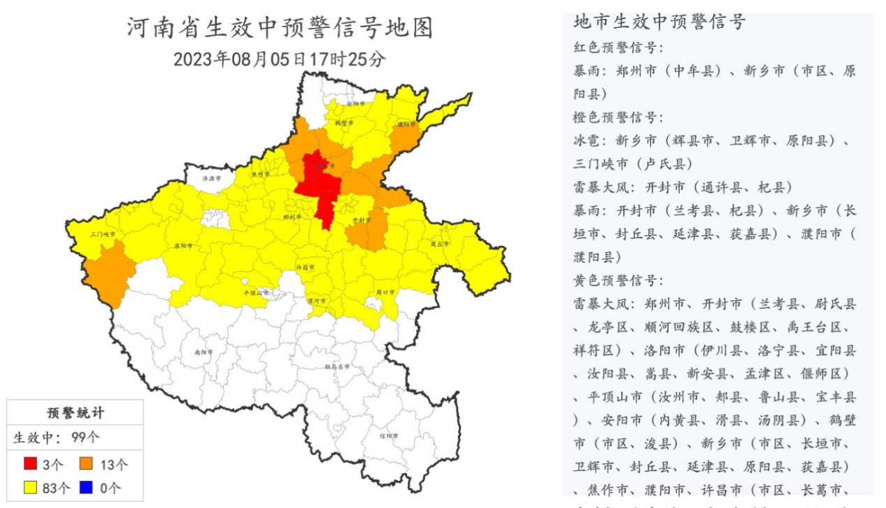 针对此次过程,全省各级气象部门严密监视天气变化,递进式开展影响预报和气象风险预警服务。8月4日,河南省气象局发布《重要天气报告》,5日10时发布《暴雨和强对流Ⅳ级预警报告》,同时启动(暴雨、强对流)Ⅳ级应急响应。截至5日17时25分,全省共发布暴雨、雷暴大风、冰雹预警信号121条,暴雨橙色预警信号16条,浚县(13:32)发布雷暴大风红色预警信号,新乡(14:53)发布暴雨红色预警信号,中牟县(15:51)发布暴雨红色预警,生效中的预警信号99条。各地各部门需继续密切关注属地气象台站发布的最新天气预报、气象灾害预警信号和气象风险提示。全省各级气象部门将继续加强监测,做好预报预警服务。