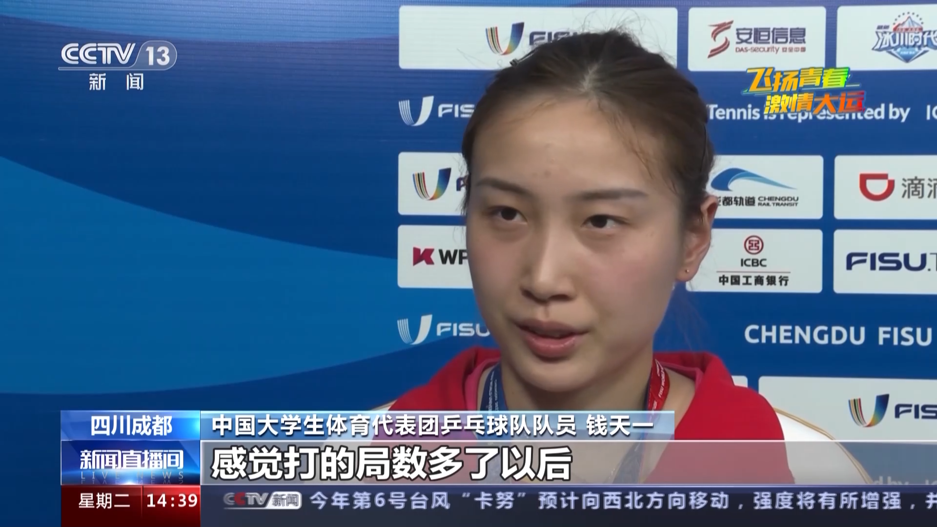 中国大学生体育代表团乒乓球队队员 钱天一:感觉打的局数多了以后,在场上有时候特别是比分差距大一点的时候,自己容易走神。经过调整,也是对自己的一种锻炼。